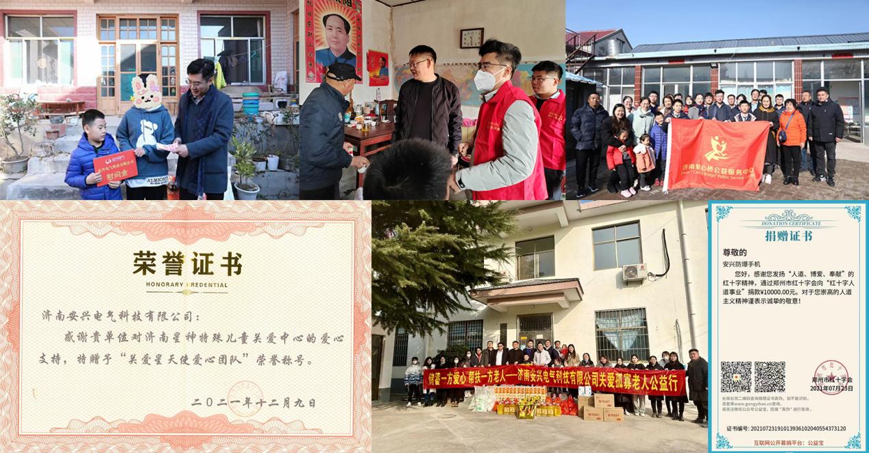 海纳百川,有容乃大。杜兴华先生在煤化安全通讯领域做出杰出成就外,秉承“不忘初心,方得始终”的理念,带领公司员工坚持为公益事业做贡献。先后扶持了几十个贫困山区的孩子和家庭、为自闭症公司的儿童举办圣诞活动送去温暖,2021年郑州水灾、2023年甘肃地震募捐等等,赢得了山东红十字会、济南市政府等各界的认可。