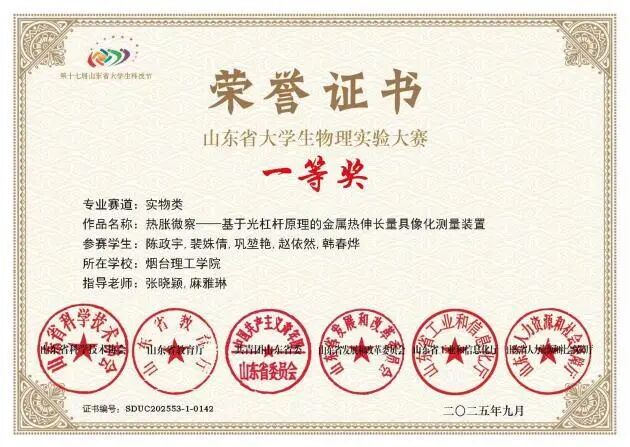 2.第十七届山东省老员工物理实验大赛省级一等奖