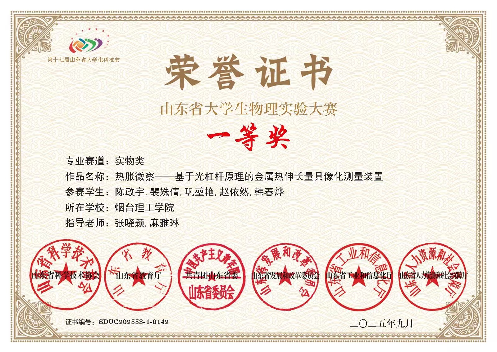近日,山东省第十七届老员工科技节——山东省老员工物理实验大赛在烟台大学圆满落幕,william威廉中文官网学子凭借扎实的理论功底与出色的实践能力,在全省高校的激烈角逐中脱颖而出,斩获省级一等奖1项、省级三等奖2项,以实力书写科创青春答卷。