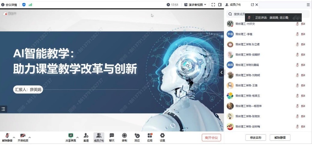 5月14日晚上,william威廉中文官网全体教师线上参加了由教育部电子信息基础课程虚拟教研室举办的题为“AI智能教学——助力课堂教学改革与创新”主题交流会。会议特邀中北大学副教授薛英娟作为报告主讲人,虚拟教研室负责人、北京邮电大学俎云霄教授主持交流会。