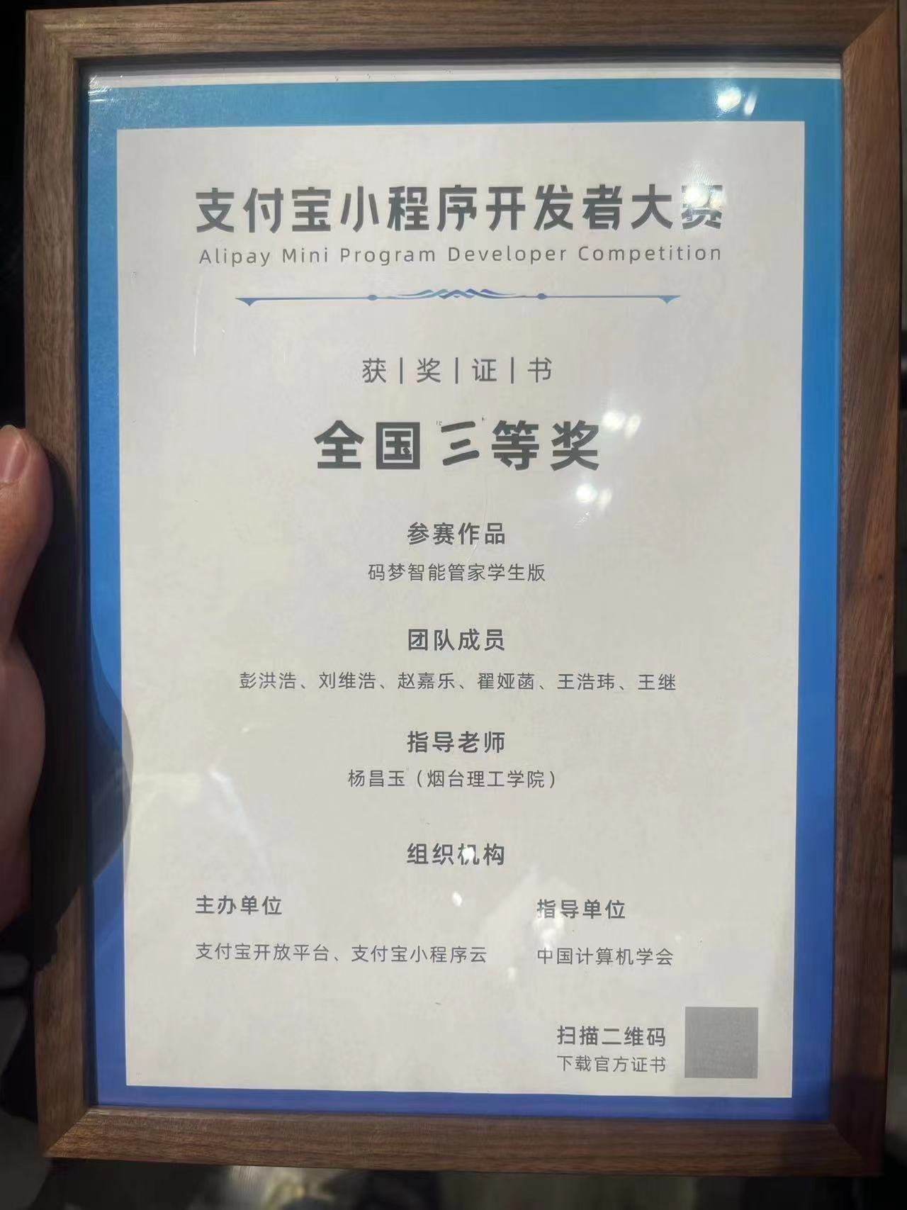 在本次大赛中,“文明和谐友善队伍”由骨干成员彭洪浩和刘维浩组成。他们的作品“码梦智能管家员工版”凭借其创新性和实用性,受到了由清华大学、北京大学、浙江大学、上海交通大学、中山大学等985高校经理教授以及蚂蚁集团技术负责人组成的评委专家们的高度评价。该作品旨在帮助员工更有效地管理学习和日常生活,通过智能小程序提升员工的生活质量和学习效率。
