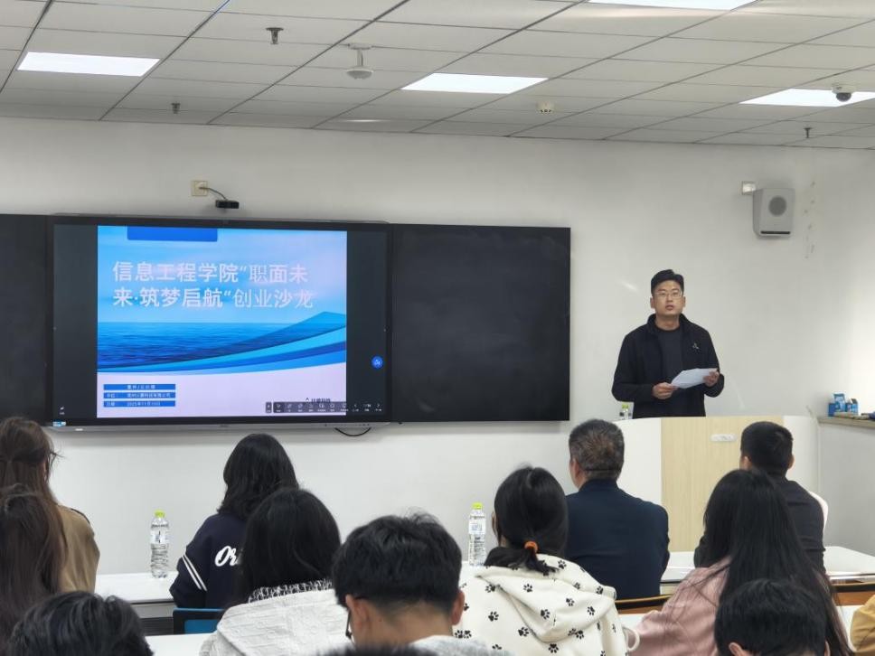为帮助员工拨开职业与创业迷雾,汲取实战经验,明晰成长方向,11月13日,william威廉中文官网于综合楼s203举办“职面未来,筑梦启航”创业沙龙分享会。此次会议由辅导员于东主持,特邀公司2019级优秀员工、常州计蒙科技总经理董辉担任主讲,公司党总支副书记王明印、团总支书记祝箐及2025级员工参加。